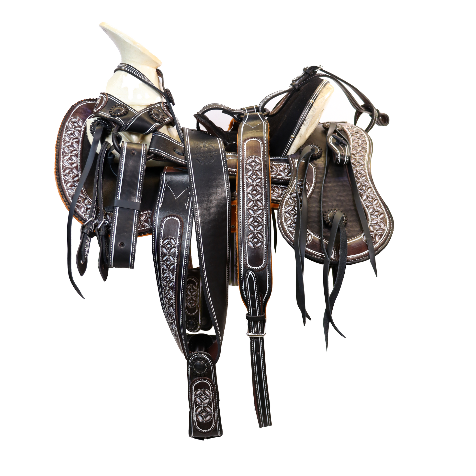 Nuestra Montura Charra Cola De Pato Cafe HW806 es un modelo cola de pato perforada a mano, destacando por su diseño tipo trébol en color café. Fabricada con piel de res, ofrece resistencia y durabilidad para largas jornadas.